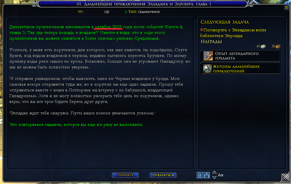 Баг-лист Ошибки перевода Дальнейшие приключения Элладана и Элроира Закрыт Дальнейшие приключения Элладана и Элроира Какую версию Наследия вы используете?: 3.x Не вполне в этом уверен, но как будто по описание первого и последующих квестов говорит о том что события происходят после прибытия Фродо в Ривенделл и до того как Братство отправилось в путь. Следовательно должен быть октябрь 3018 года, а не 3019. 31.08.2025 02:40 85 Aerion 1 комментарий unnamedartist 31.08.2025 16:55 # ↓ Спасибо за ваше сообщение. Поправлено.