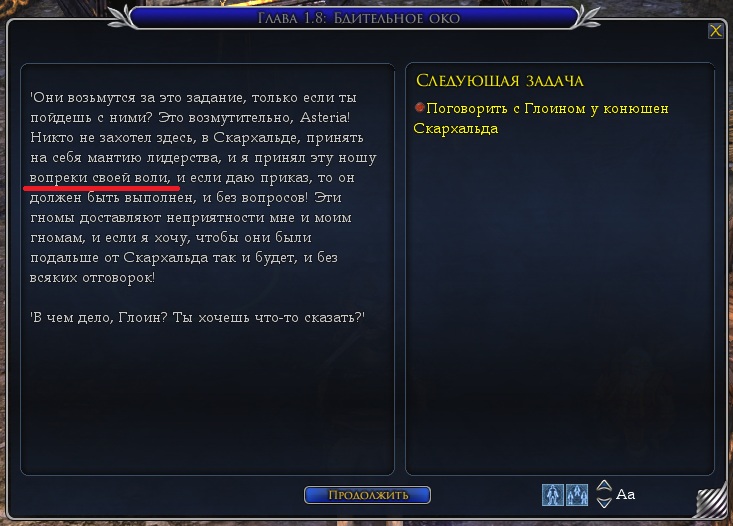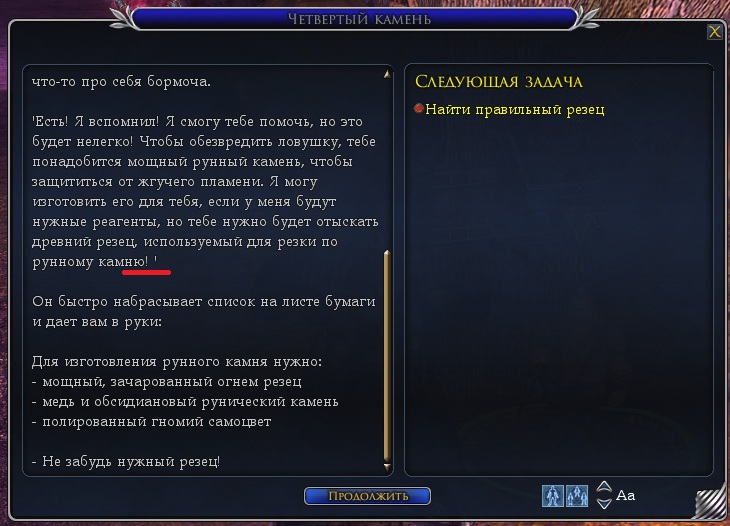 Скрин 188 — по квесту Четвёртый камень надо принести предметы: резец, полированный самоцвет и рунический камень (причём в квесте этот камень называется обсидиановым, а в списке рецептов он значится как камень вулкана. Но думаю это не ошибка, а часть загадки). А в двух диалогах, в этот и предыдущем (к сожалению, забыл сделать скрин), гном упоминает медь. Может имелось в виду, что рунический камень из казад-меди, а не ингредиент из списка?